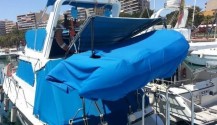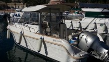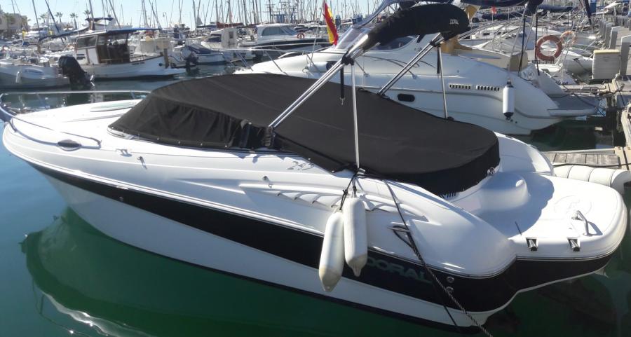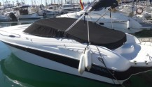 Lancha deportiva muy elegante totalmente abierta, ideal para pasar el día y tiene dos cabinas a cada banda una con literas y estiba y otra con WC. Podemos hacer alguna travesía y dormir abordo, tanto fondeados como en puerto. Tiene dos motores Mercruiser MPI 5.0 CON 260 CV cada uno, transmisión Z-Drive. Velocidad máxima 40 nudos. Muy rápida y dinámica.